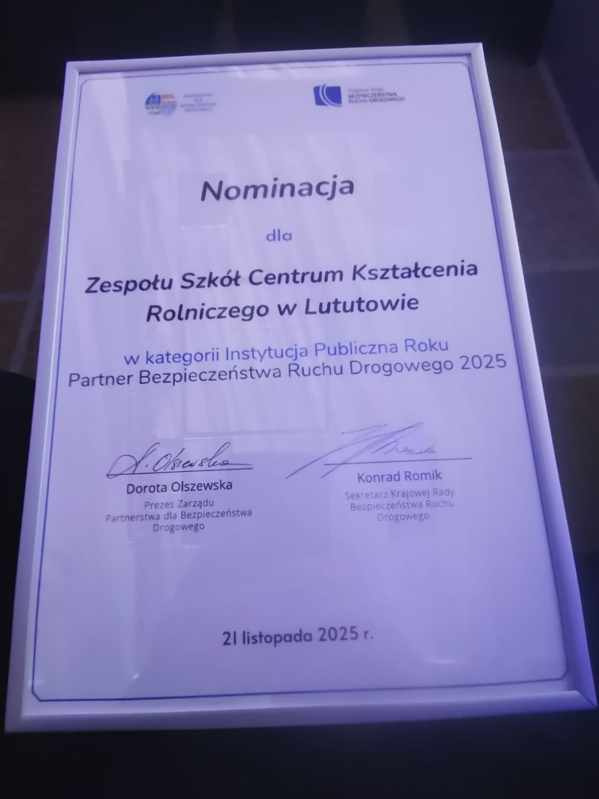 Nominacja ta jest wielkim zaszczytem i stanowi formalne potwierdzenie, że działania szkoły plasują ją w gronie ogólnopolskich liderów na rzecz poprawy bezpieczeństwa drogowego. W imieniu społeczności szkolnej, nominację z rąk Kapituły odebrał Robert Majchrowicz Dyrektor ZSCKR w Lututowie.